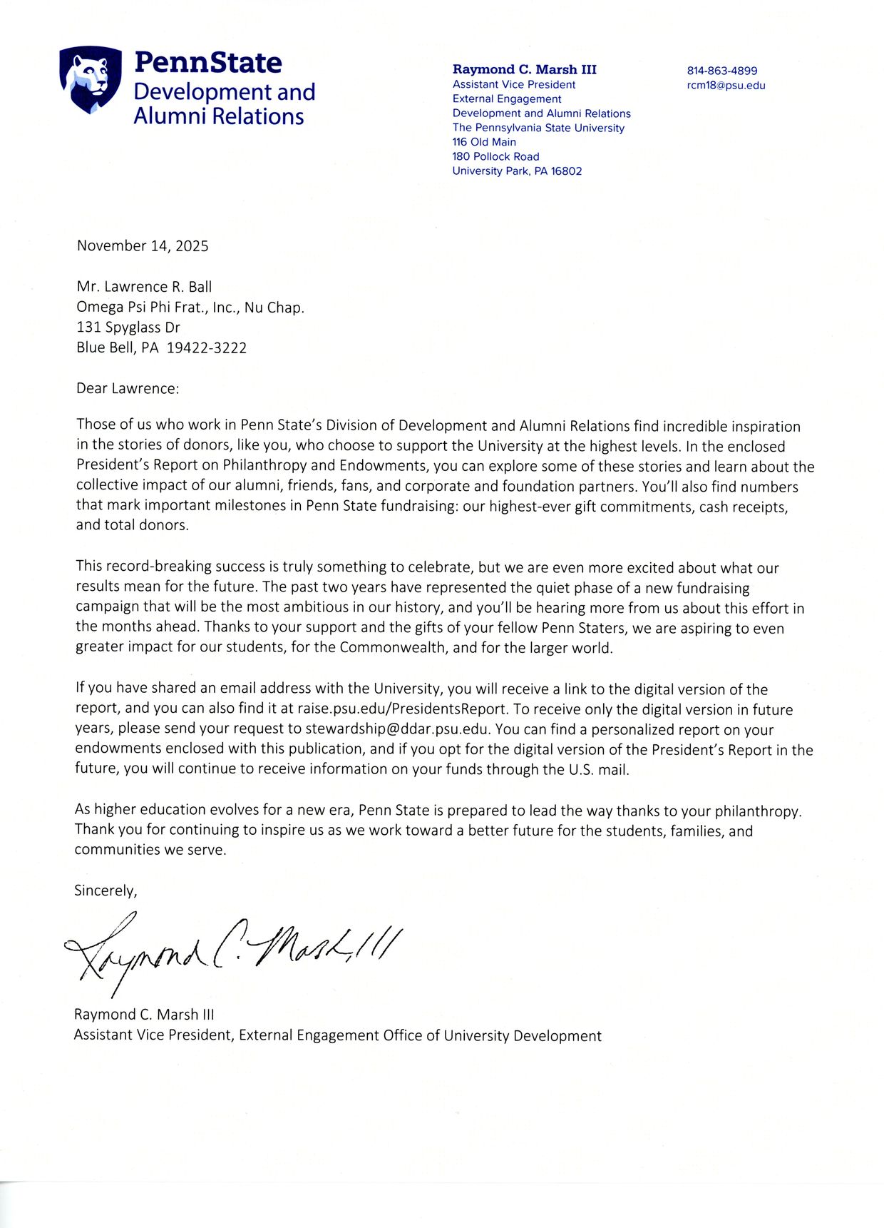 Thank you for your generous gift to the Omega Psi Phi Fraternity Nu Alumni Association Scholarship. We are thrilled to have your support. Through your donation we have been able to accomplish the establishment of an endowment and continue working towards supporting our mission to support undergraduate college students who contribute to the student body's diversity at the Pennsylvania State University and its community. You truly make the difference for us, and we are extremely grateful.