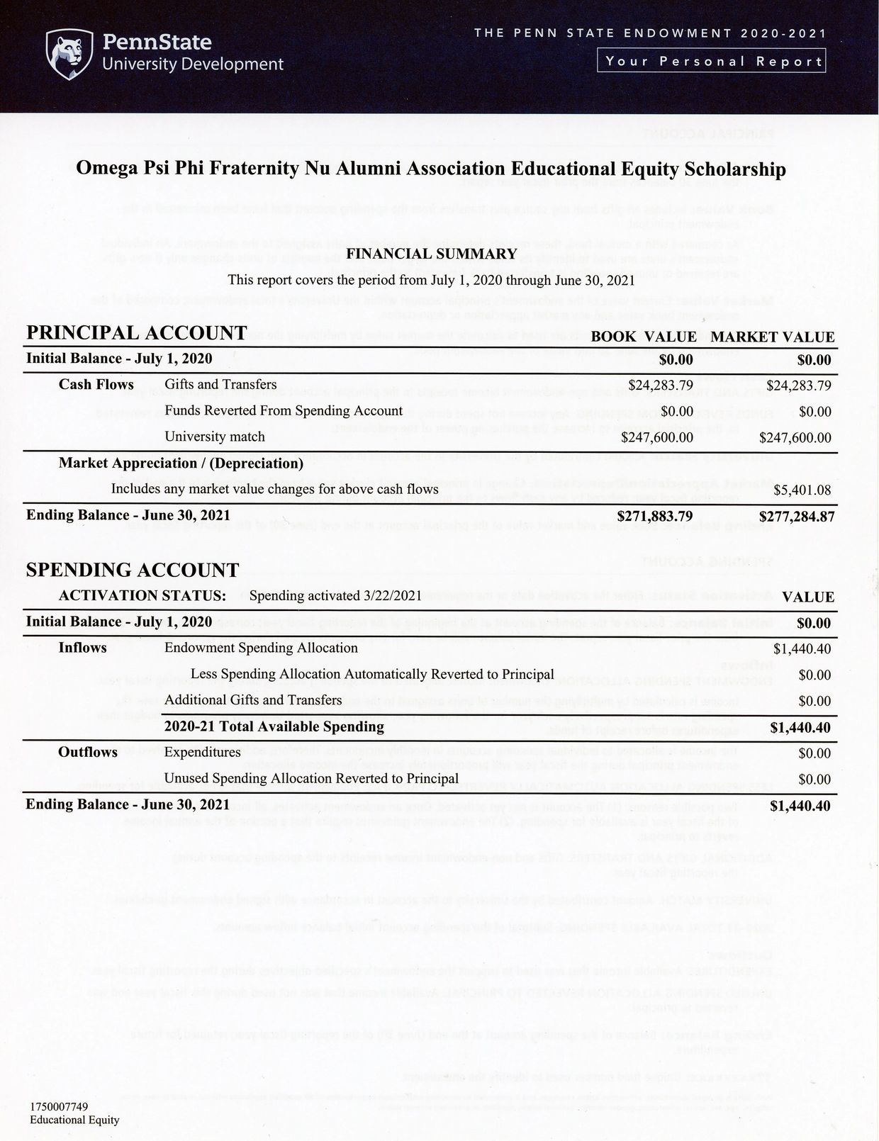 Thank you for your generous gift to the Omega Psi Phi Fraternity Nu Alumni Association Scholarship. We are thrilled to have your support. Through your donation we have been able to accomplish the establishment of an endowment and continue working towards supporting our mission to support undergraduate college students who contribute to the student body's diversity at the Pennsylvania State University and its community. You truly make the difference for us, and we are extremely grateful.